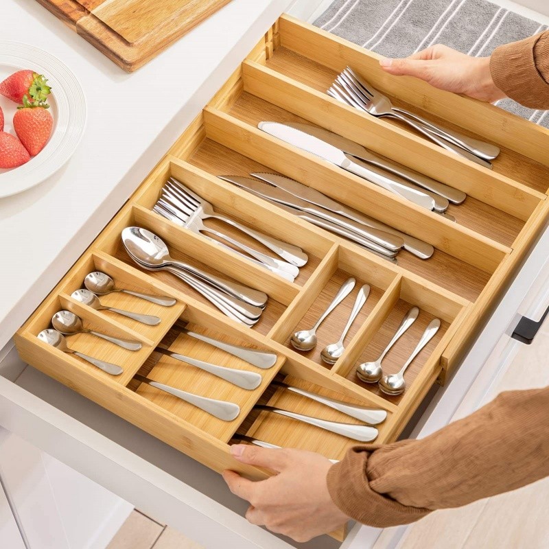 Premium Bamboo Kitchen Drawer Organizer-Expandable Silverware Organizer with Compact Cutlery for Utensils Flatware